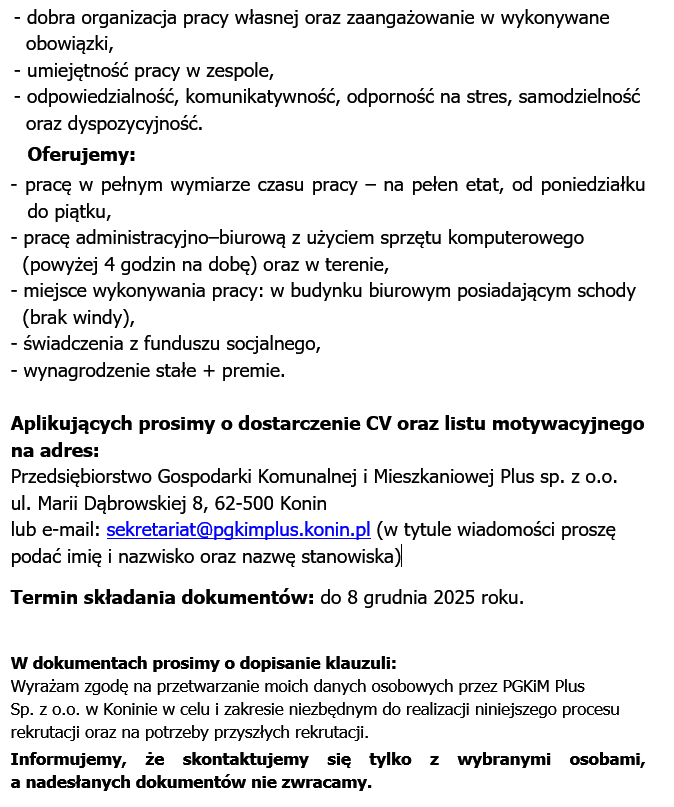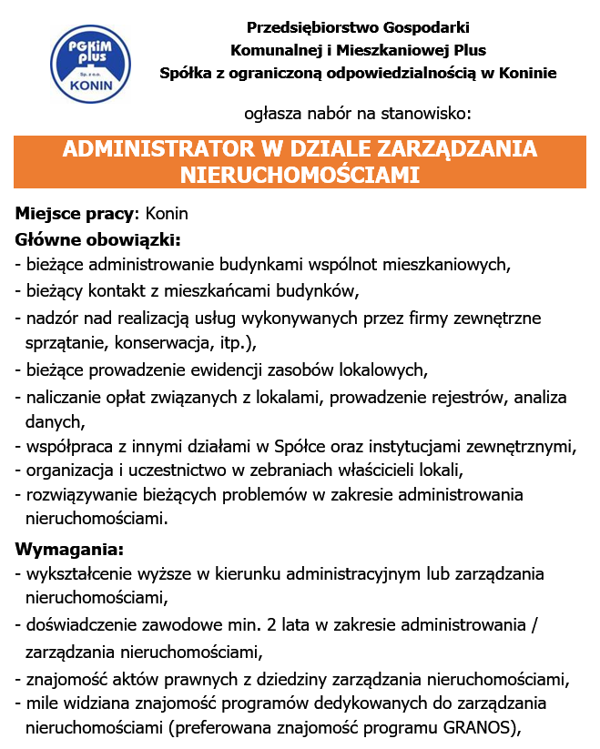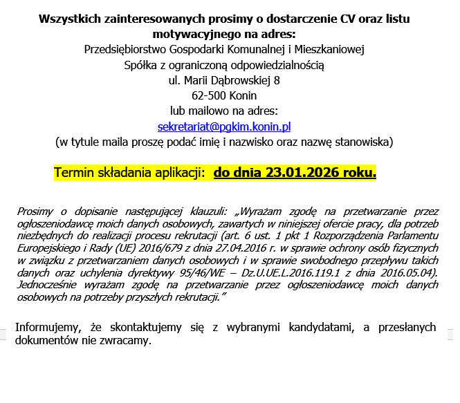 Przedsiębiorstwo Gospodarki Komunalnej i Mieszkaniowej Spółka z ograniczoną odpowiedzialnością, 62-500 Konin ul. Marii Dąbrowskiej 8