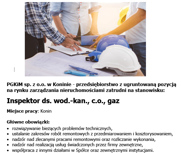 Dąbrowskiej 8, 62-500 Konin tel. (0-63) 242 82 76, fax. 242 82 24 informuje, że poszukuje wykonawców małych robót remontowych w branżach: budowlanej, instalacyjnych wod-kan, co, cwu i elektrycznych, usług
